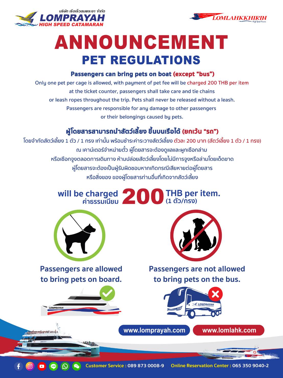 - ผู้โดยสารสามารถนำสัตว์เลี้ยง ขึ้นบนเรือได้ (แต่ไม่สามารถนำสัตว์เลี้ยงขึ้นบนรถได้) พร้อมชำระค่าระวางสัตว์เลี้ยง ตัวละ 200 บาท ณ เคาน์เตอร์จำหน่ายตั๋ว ผู้โดยสารจะต้องดูแลและผูกเชือกล่าม หรือ เชือกจูงตลอดการเดินทาง ห้ามปล่อยสัตว์เลี้ยงโดยไม่มีการจูงหรือล่ามโดยเด็ดขาด ในกรณีที่สัตว์เลี้ยงของท่านสร้างความเดือดร้อนหรือก่อให้เกิดอันตรายสร้างความเสียหาย ต่อร่างกาย หรือทรัพย์สิน ท่านต้องเป็นผู้รับผิดชอบค่าเสียหายที่เกิดขึ้นแต่เพียงฝ่ายเดียว และการนำสัตว์เลี้ยงขึ้นเรือนั้น สัตว์เลี้ยงของท่านสามารถอยู่ได้เฉพาะบริเวณพื้นที่นอกห้องโดยสารปรับอากาศเท่านั้น ***
